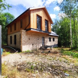 "Загородный дом 142 кв.м. на участке 7, 4 сотки в д. Гончары, КП Гончарная Слобода. Поселок в окружении соснового леса в 36 км от МКАД по Ленинградскому шоссе или М11. На данный момент в состоянии whitebox. Дом из газоблока 30 см, дополнительно утепленный 3 см. Облицовка - царский...